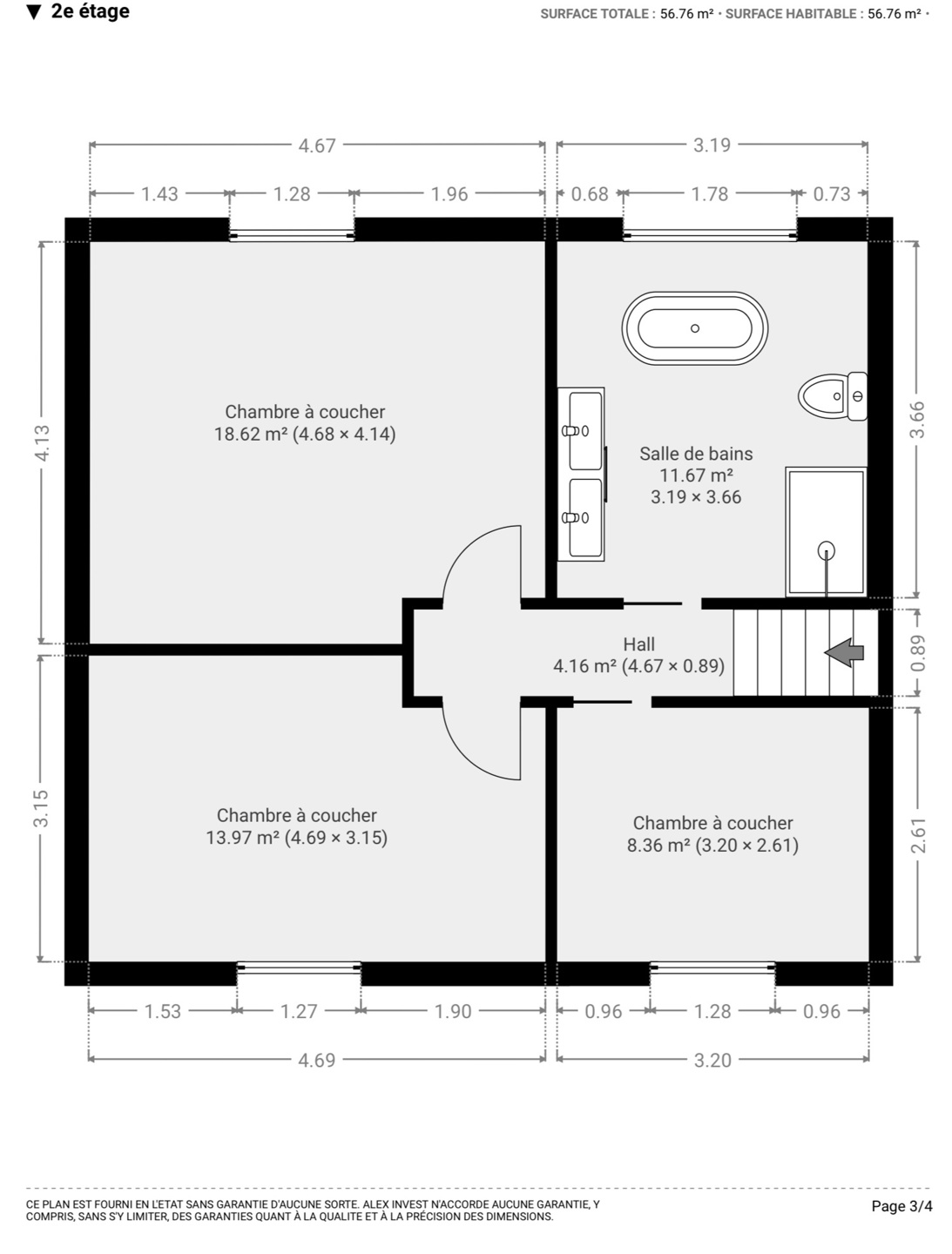 => 2ème étage : Un hall de nuit dessert trois chambres de 8, 14 et 19 m², ainsi qu’une salle de bain complète avec baignoire, douche, double vasque et WC.