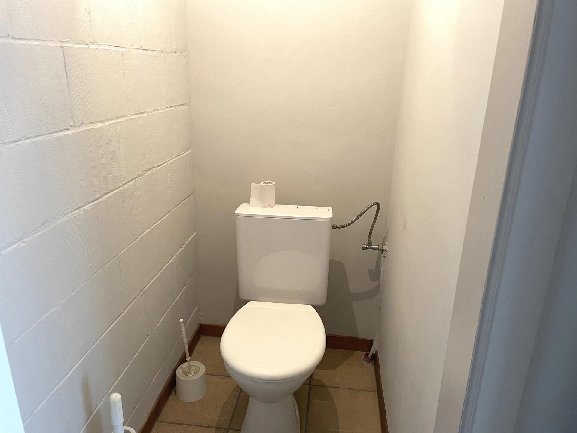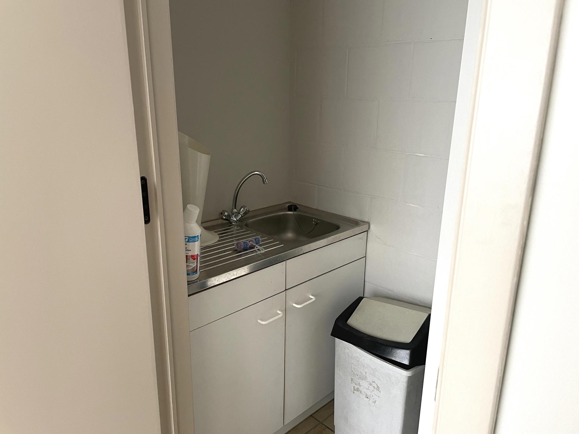 Il se compose comme suit : large hall d'entrée, bureau de +/- 13m2 avec un WC séparé et un évier.