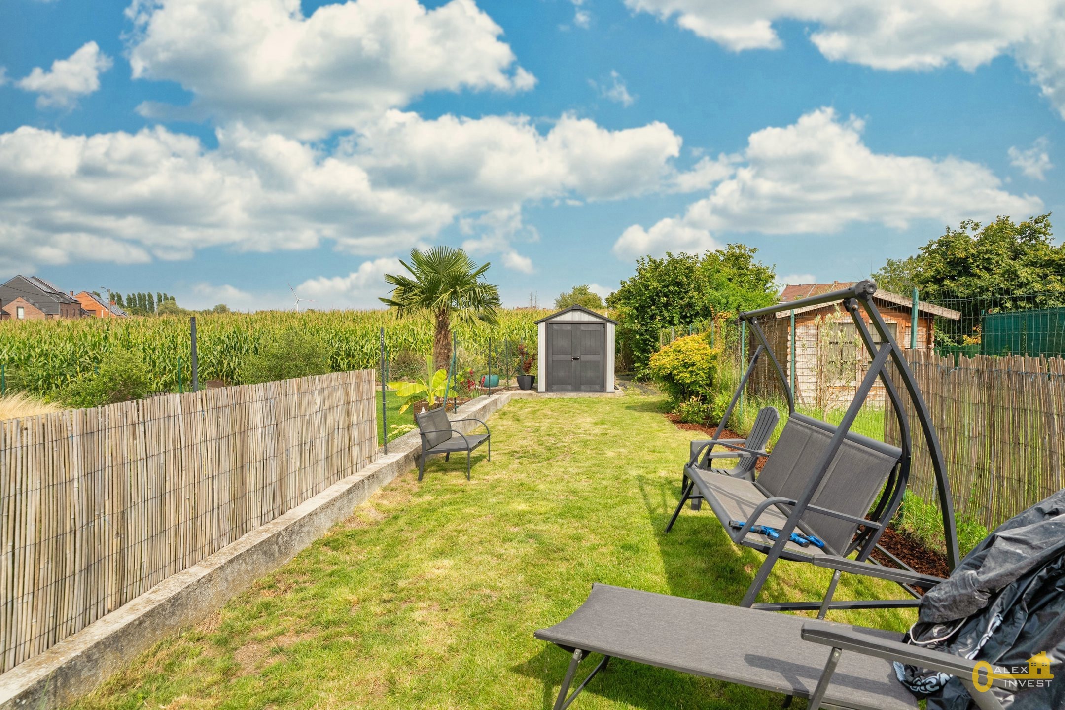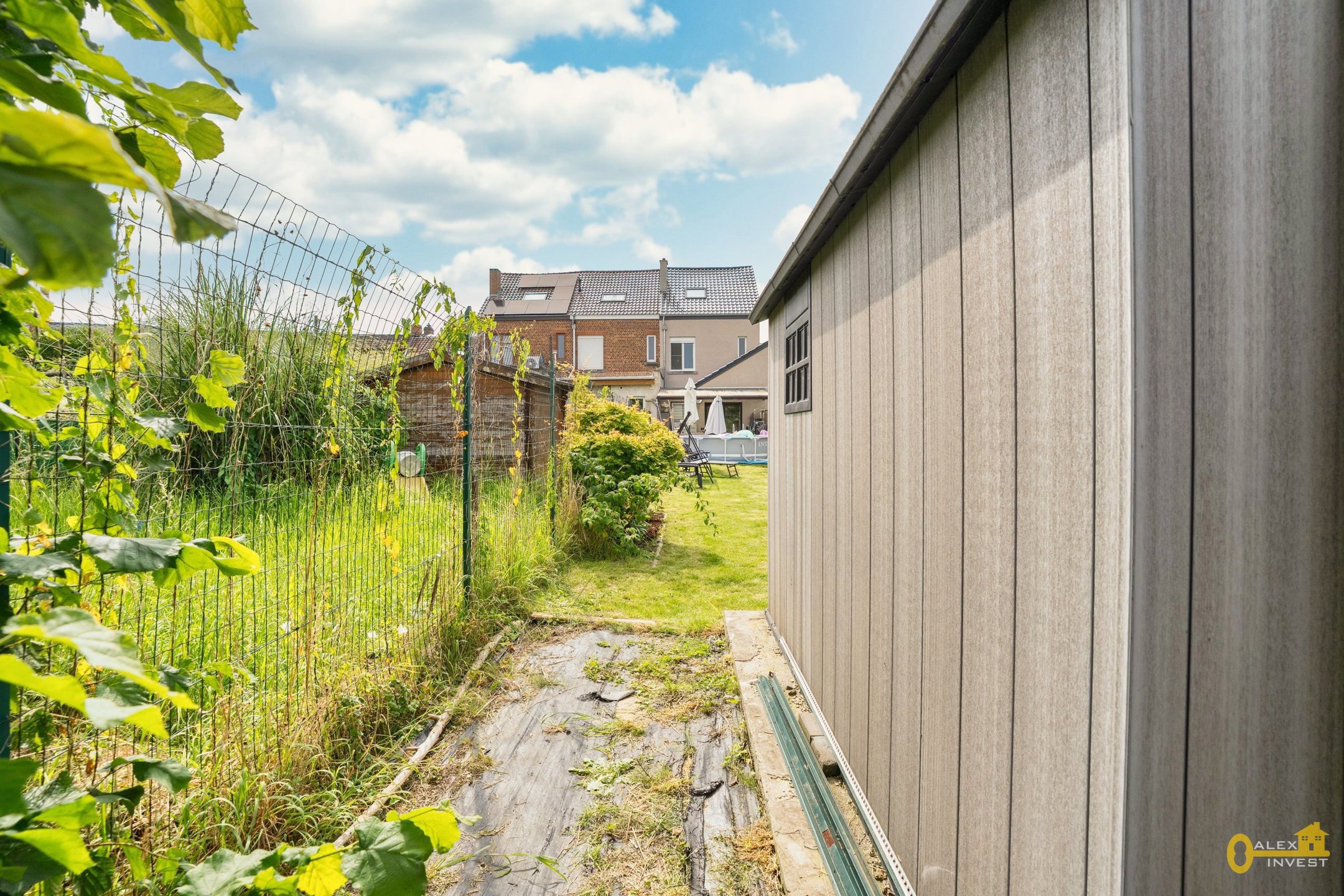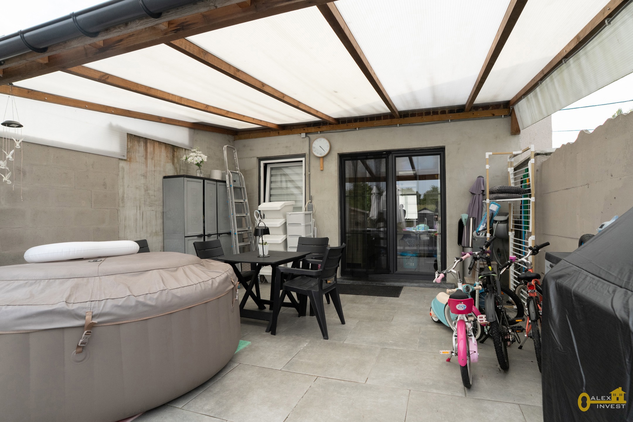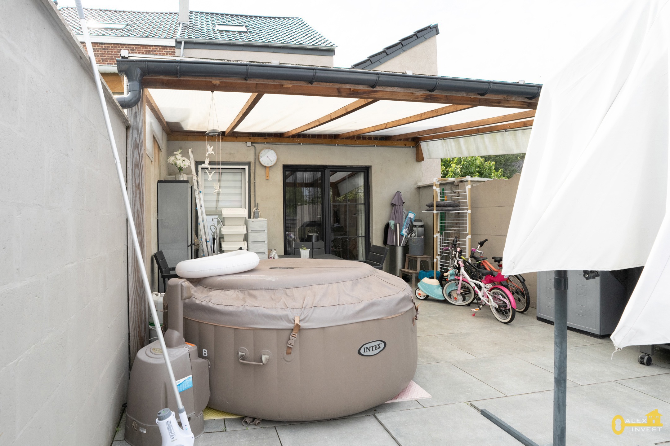EXTERIEUR: GRANDE TERRASSE de +- 43 m² dont une partie est couverte! Jardin avec chalet.