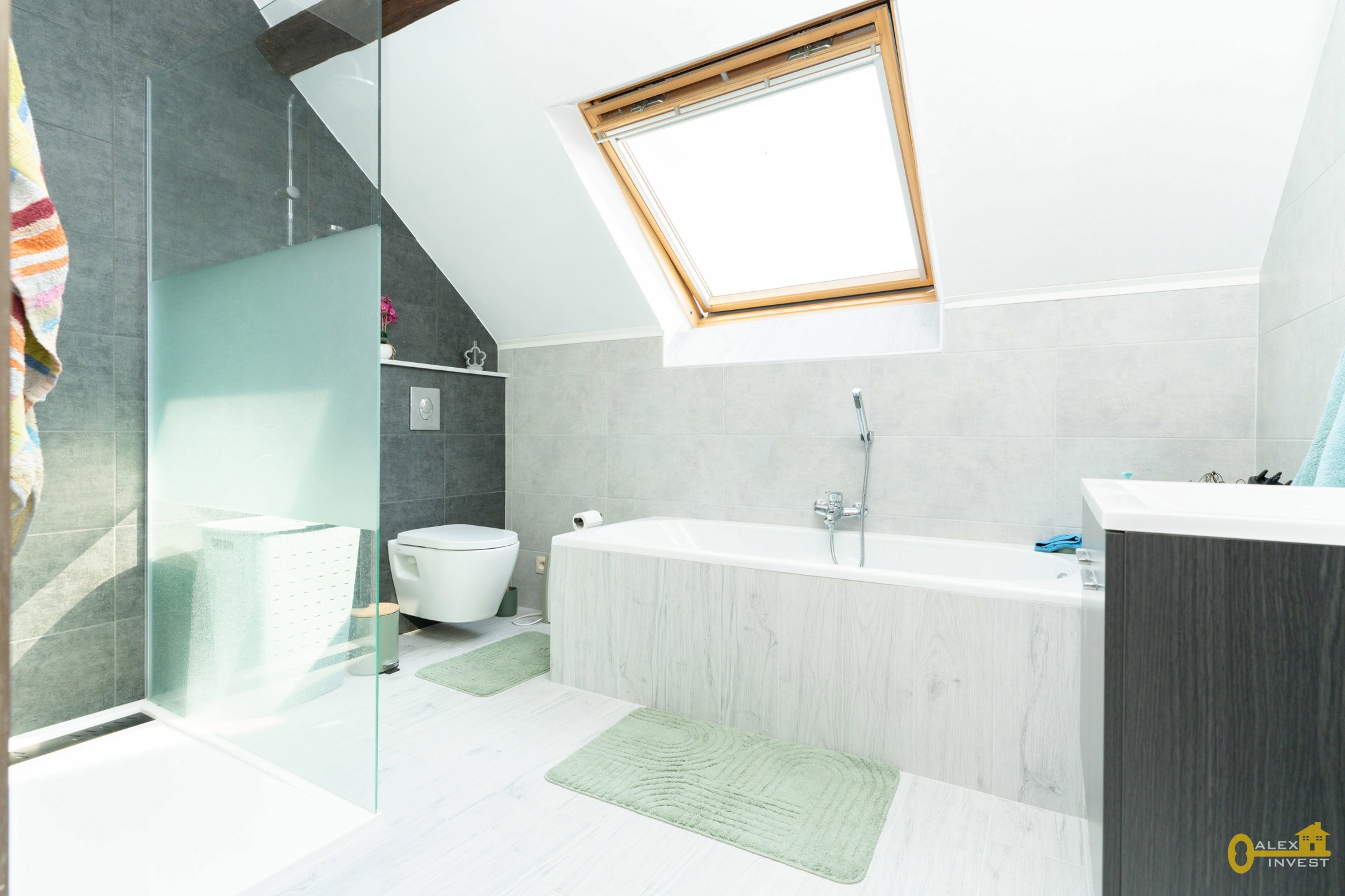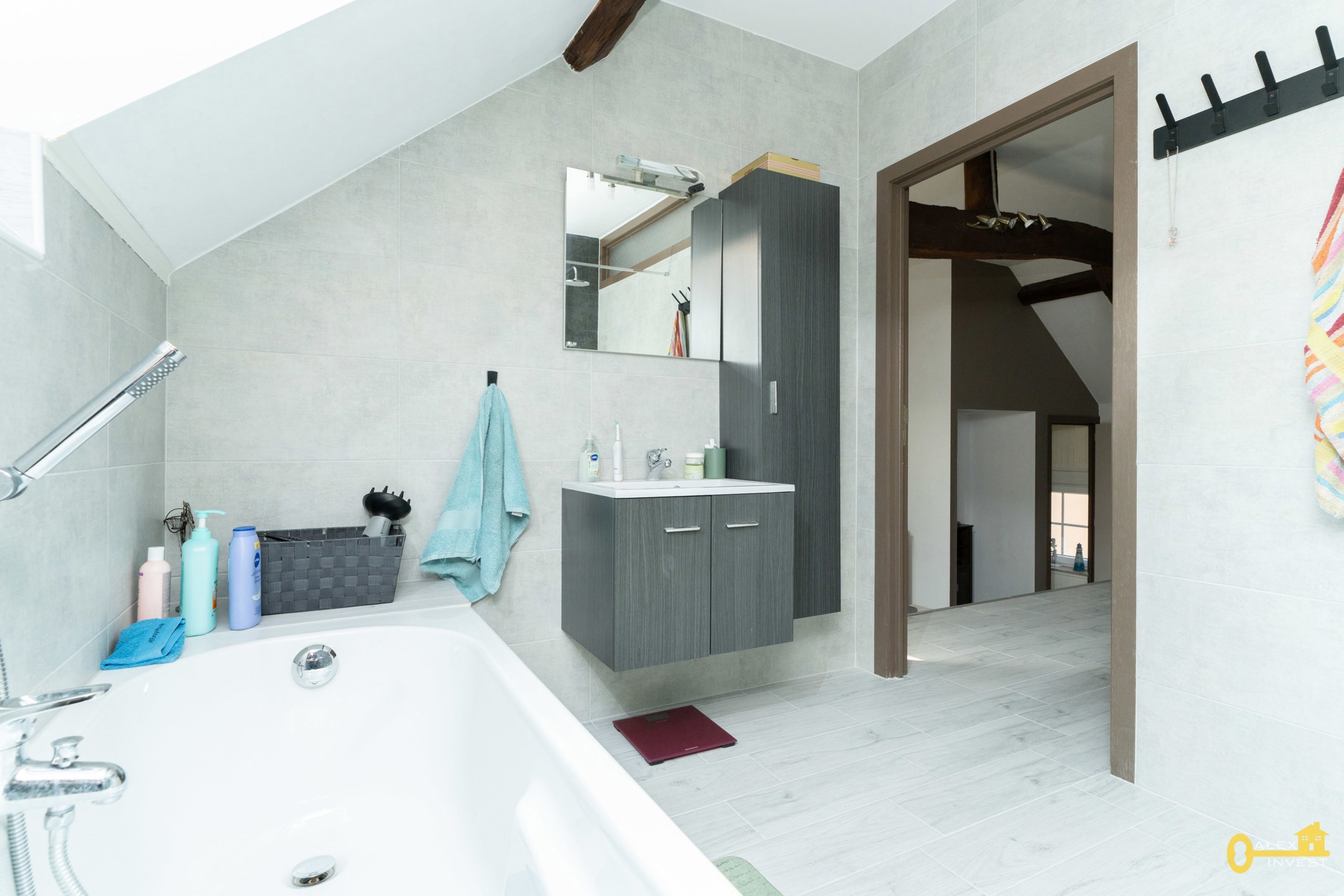 1e ETAGE: hall de nuit, 2 chambres dont une très grande (+- 27 m²), cuisine équipée avec espace dinatoire et coin buanderie, salle de bain avec bain, douche, lavabo et wc. La cuisine a été conçue pour pouvoir intégrer un frigo américain.