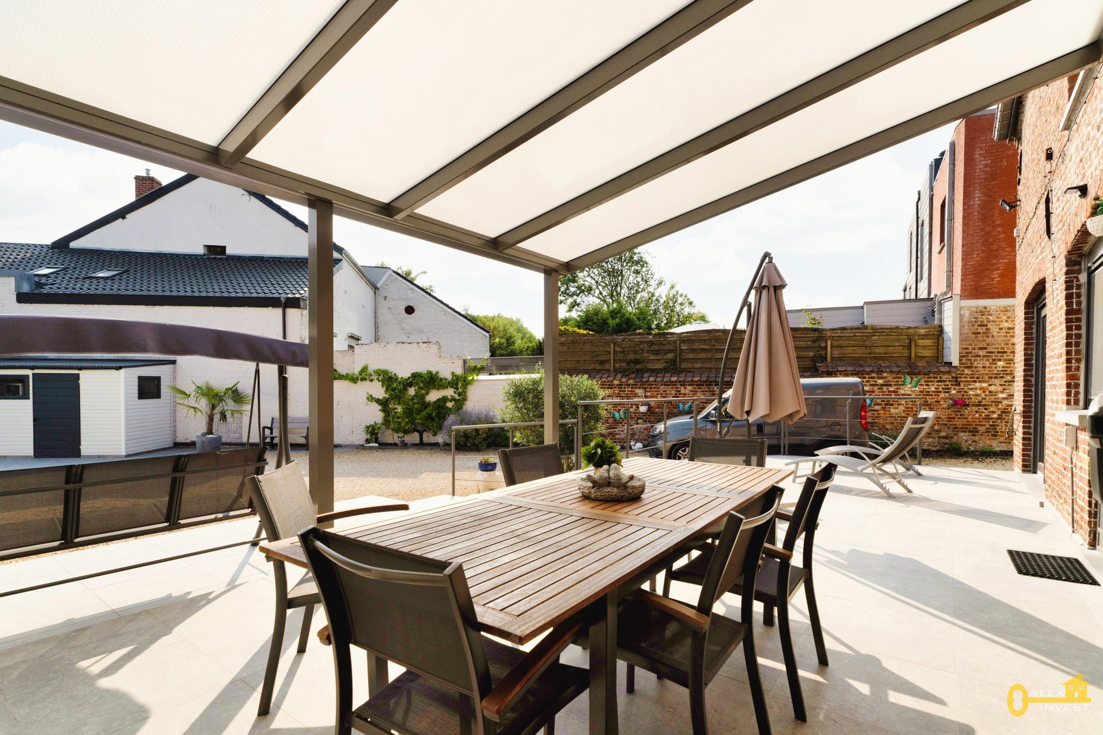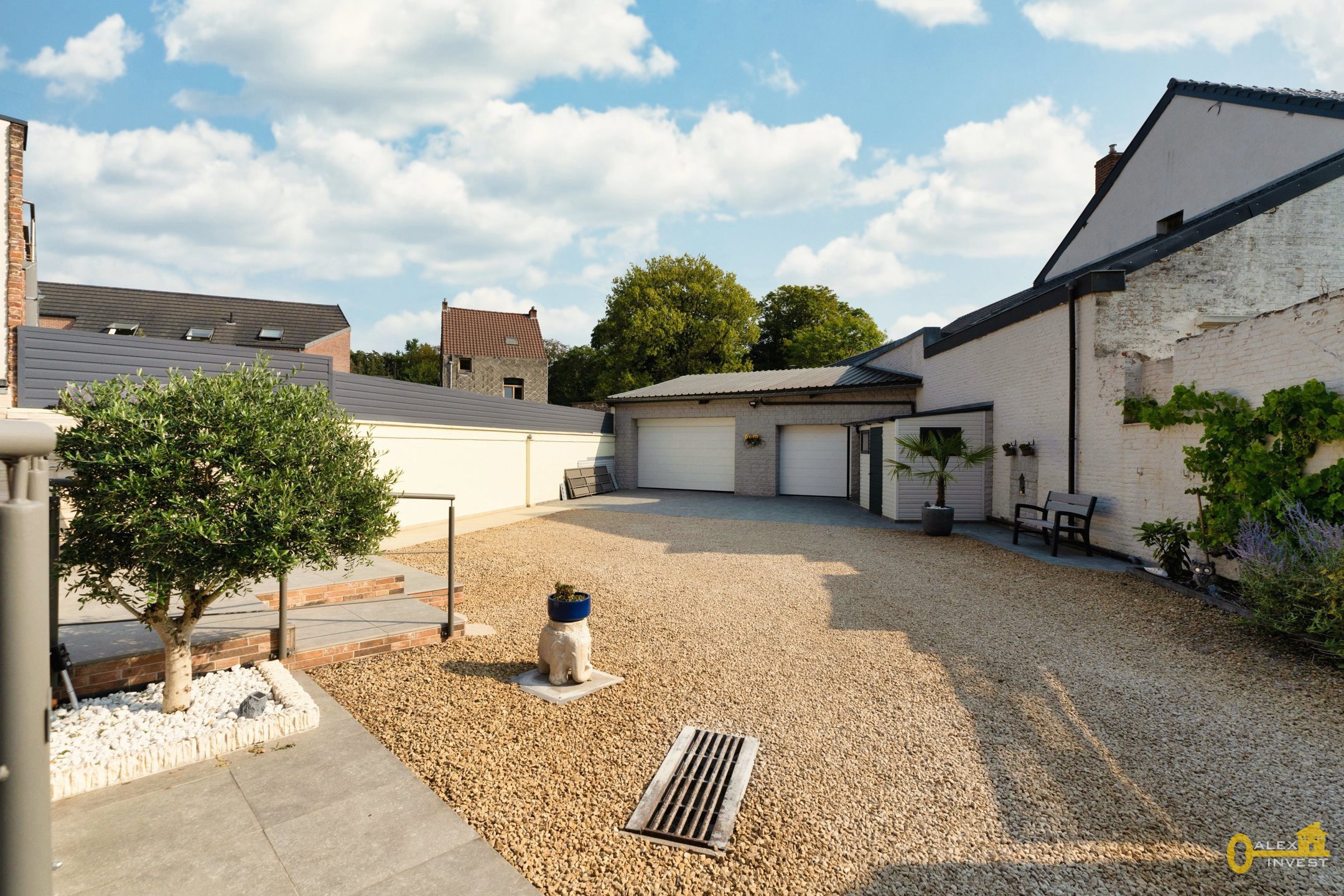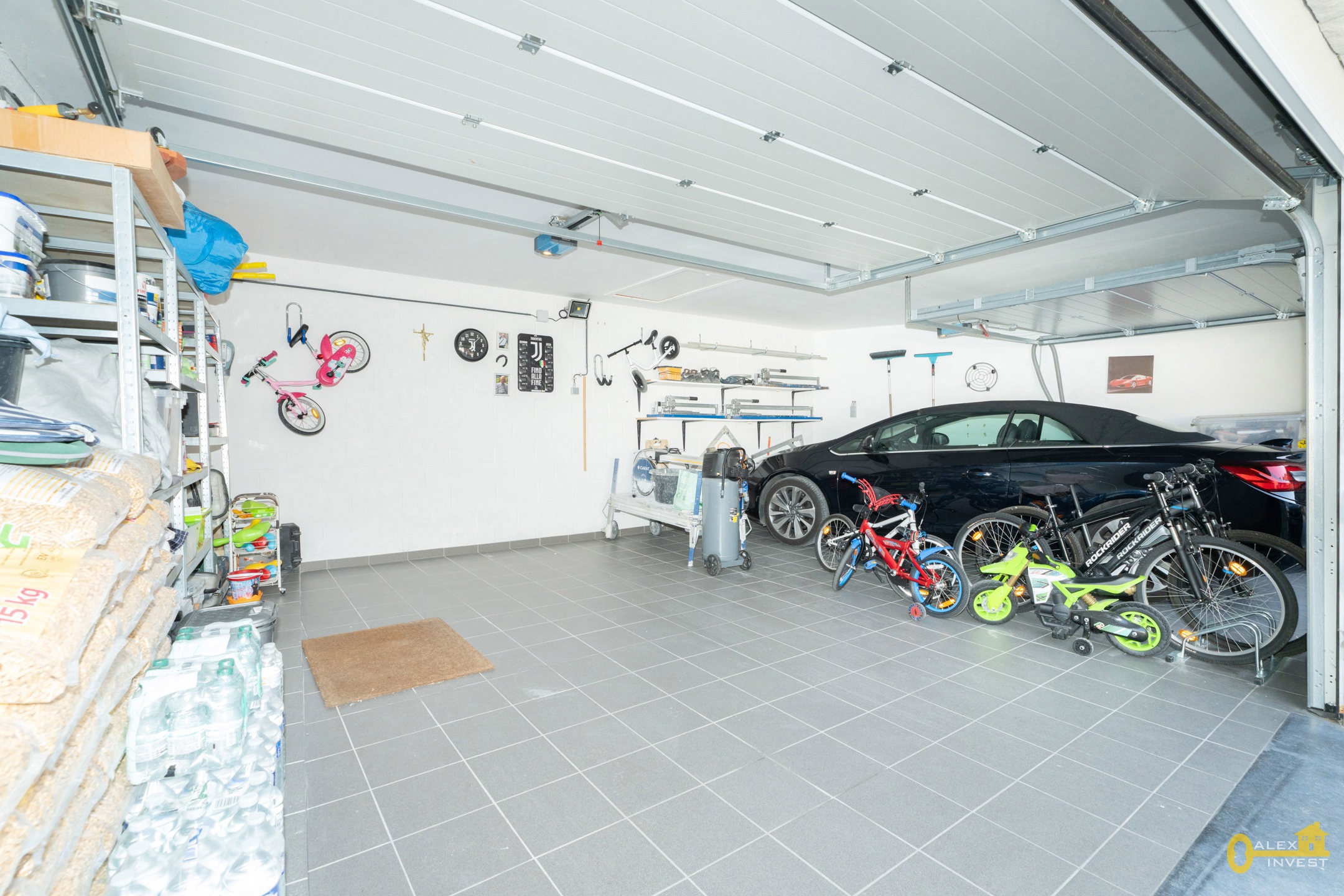 EXTERIEUR: très GRANDE TERRASSE (+- 62 m²).Une partie de la terrasse est couverte par une PERGOLA en alu (2022), GARAGE DOUBLE carrelé de 5.10m de profondeur sur 10m de large (2 portes motorisées) avec espaces de rangement et grenier accessible par une trappe. Espace de PARKING carrelé devant les garages. L'accès aux garages se fait par l'entrée avec grille motorisée derrière laquelle les invités trouveront où stationner en toute sécurité! Abri de jardin (+- 6 m²) avec appentis. Afin de garantir son intimité, le jardin a été équipé de brise-vues en alu (2025).