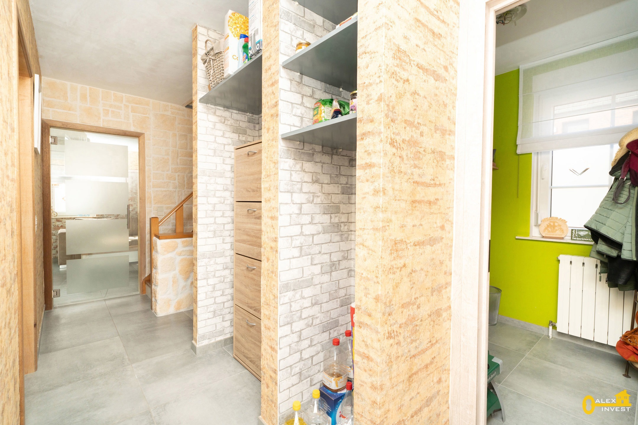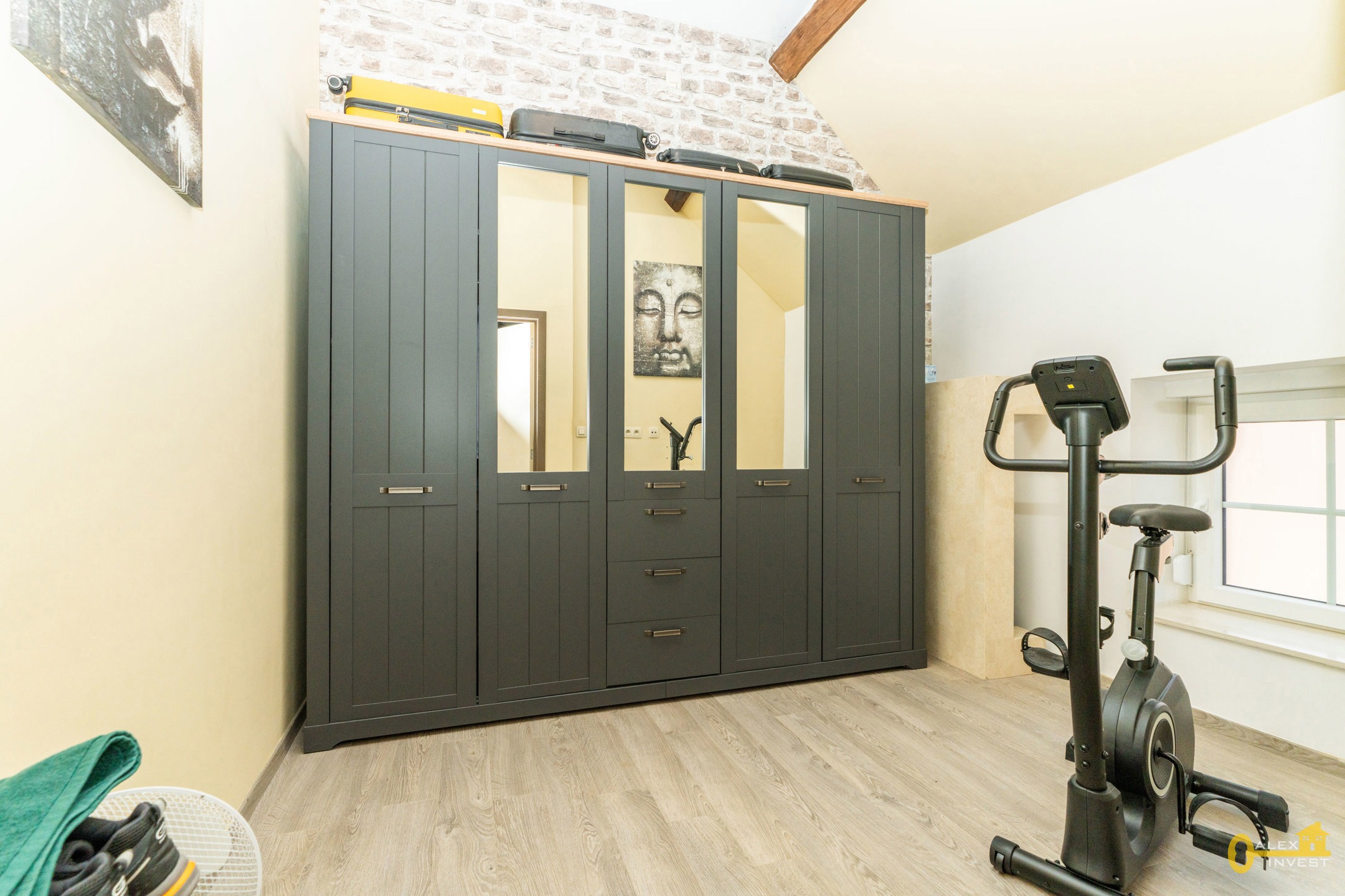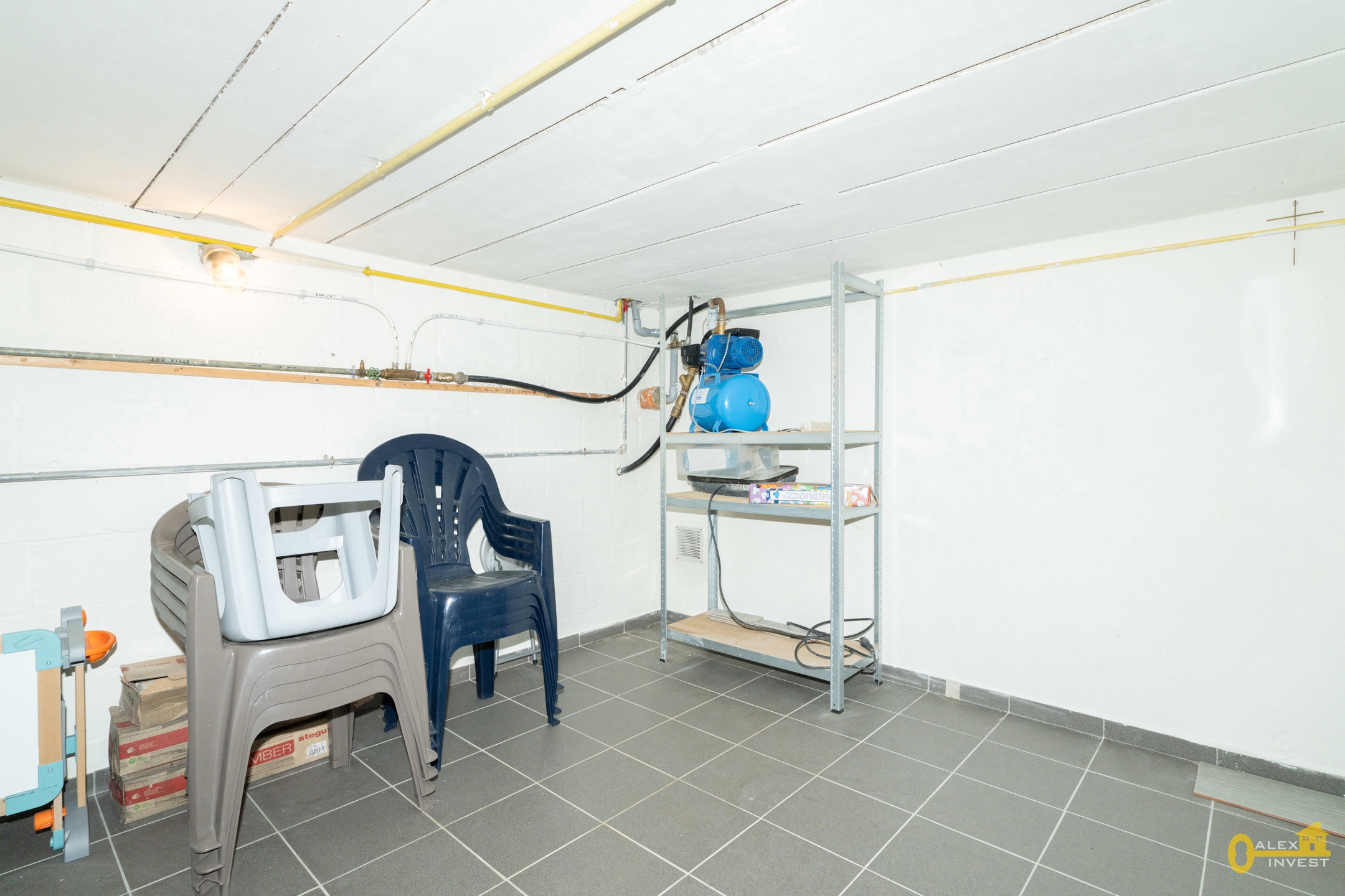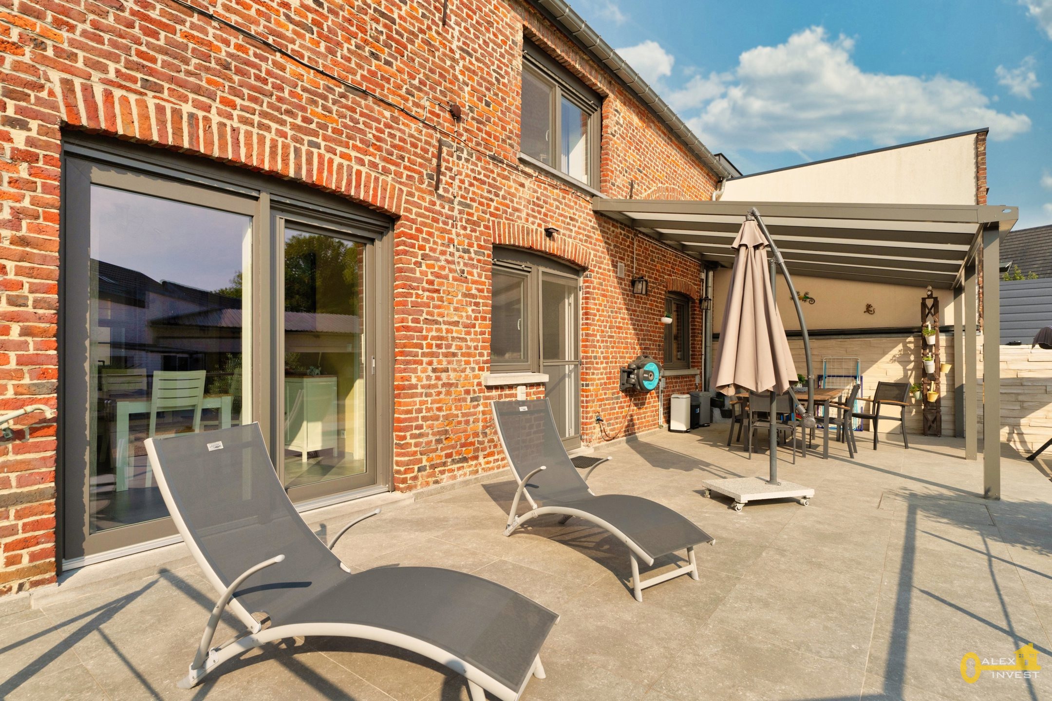 EXTERIEUR: très GRANDE TERRASSE (+- 62 m²).Une partie de la terrasse est couverte par une PERGOLA en alu (2022), GARAGE DOUBLE carrelé de 5.10m de profondeur sur 10m de large (2 portes motorisées) avec espaces de rangement et grenier accessible par une trappe. Espace de PARKING carrelé devant les garages. L'accès aux garages se fait par l'entrée avec grille motorisée derrière laquelle les invités trouveront où stationner en toute sécurité! Abri de jardin (+- 6 m²) avec appentis. Afin de garantir son intimité, le jardin a été équipé de brise-vues en alu (2025).