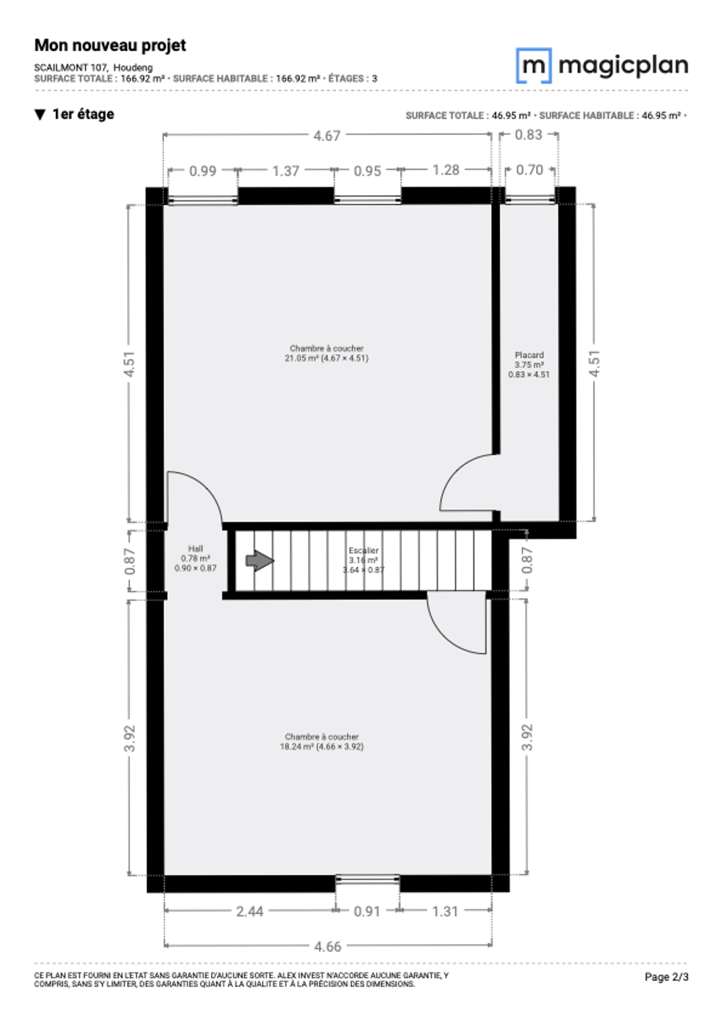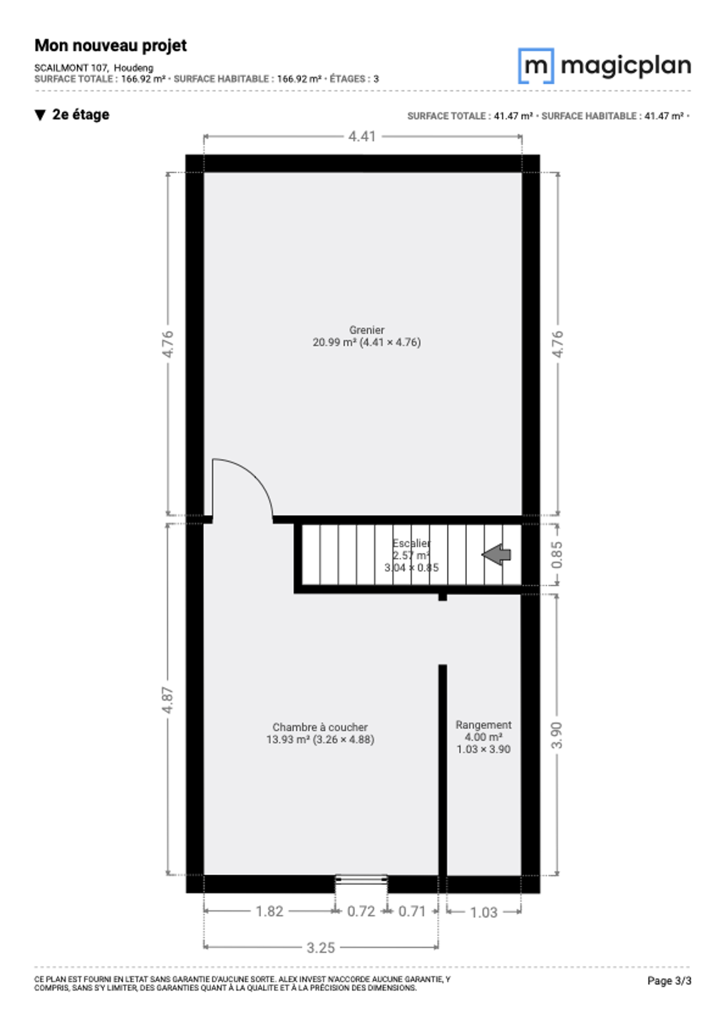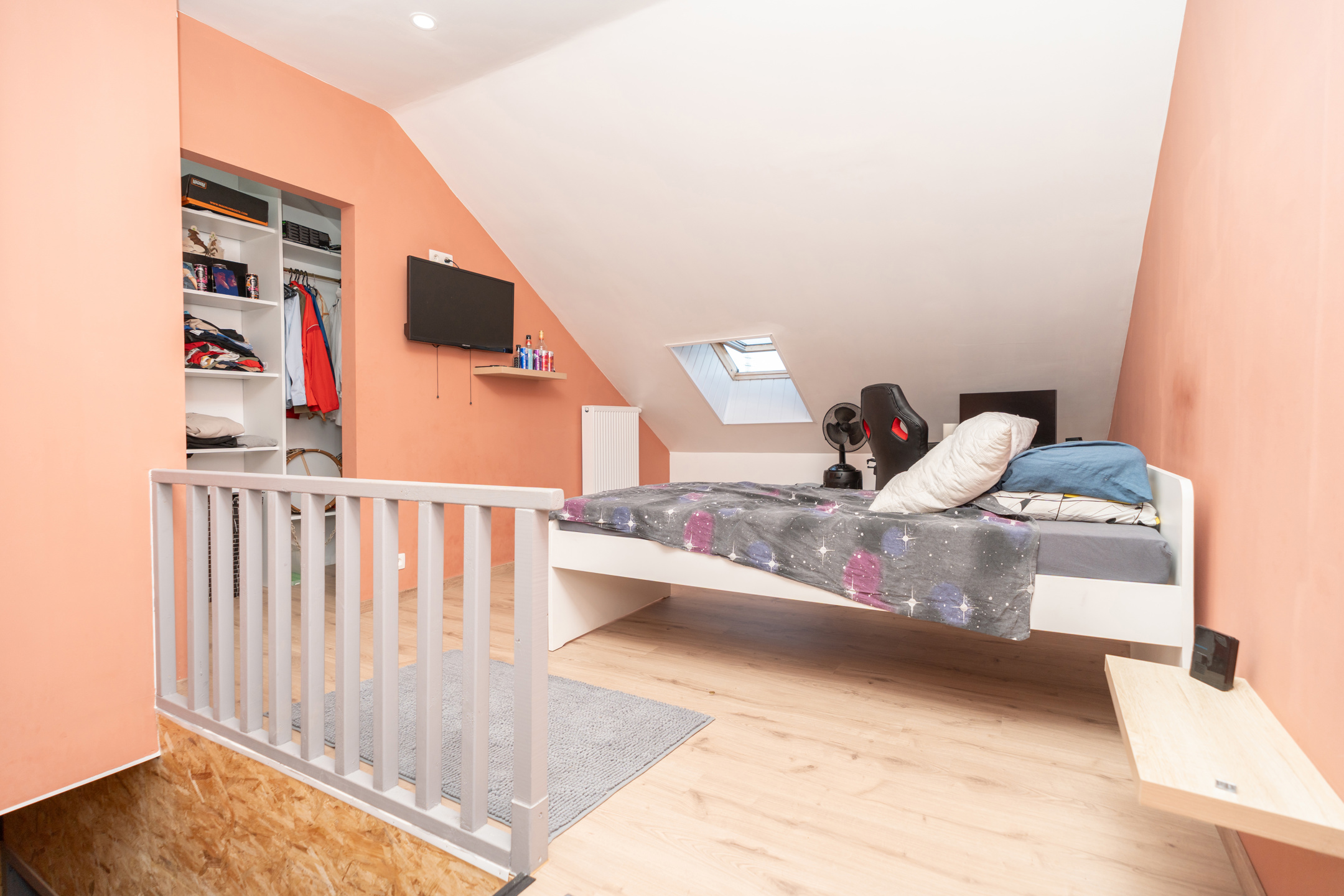 => 2ème étage, une troisième Chambre de +/- 14 m² avec coin Dressing, ainsi qu’un Grenier aménageable de +/- 21 m², offrant un potentiel supplémentaire selon vos besoins (bureau, chambre, salle de jeux...).