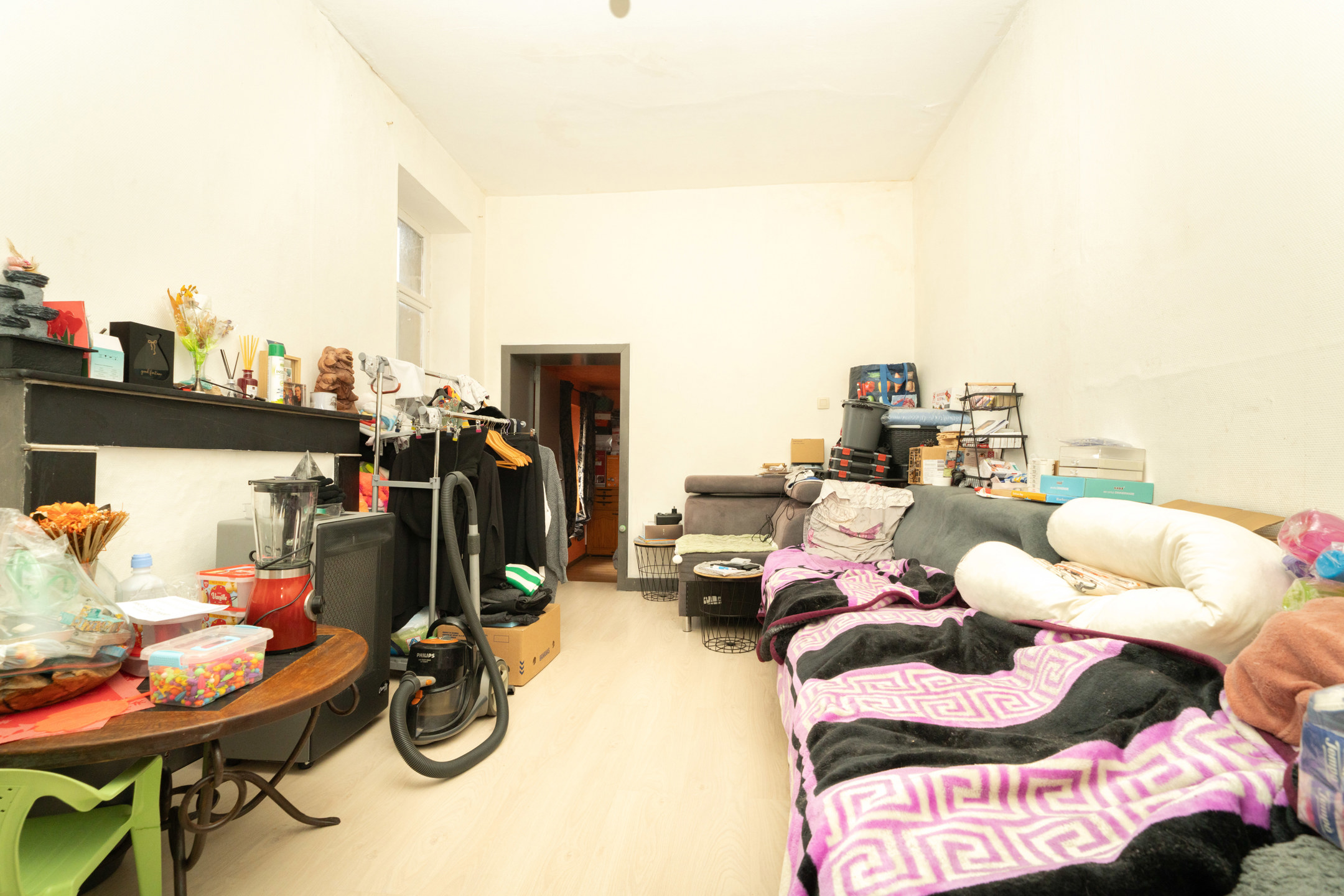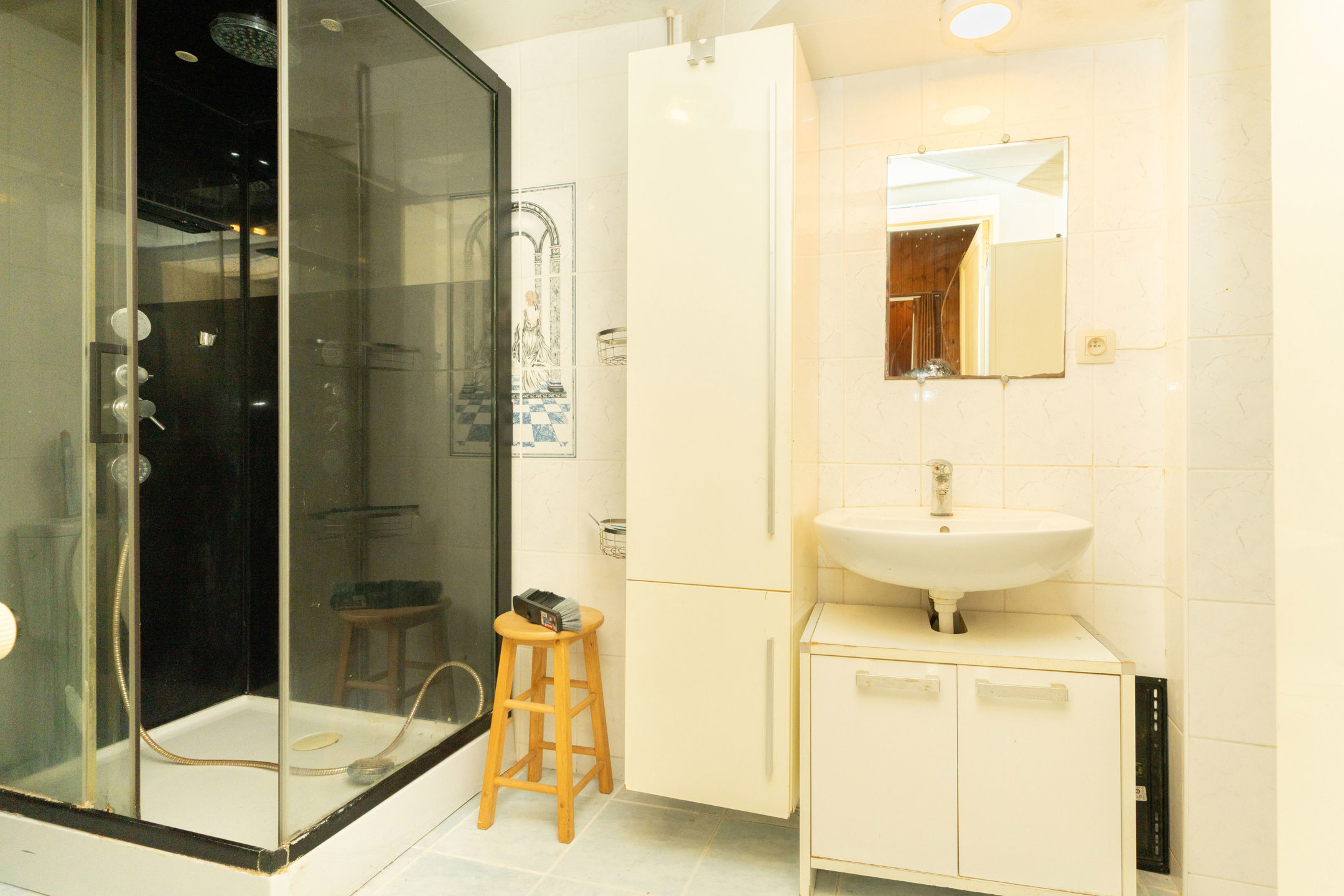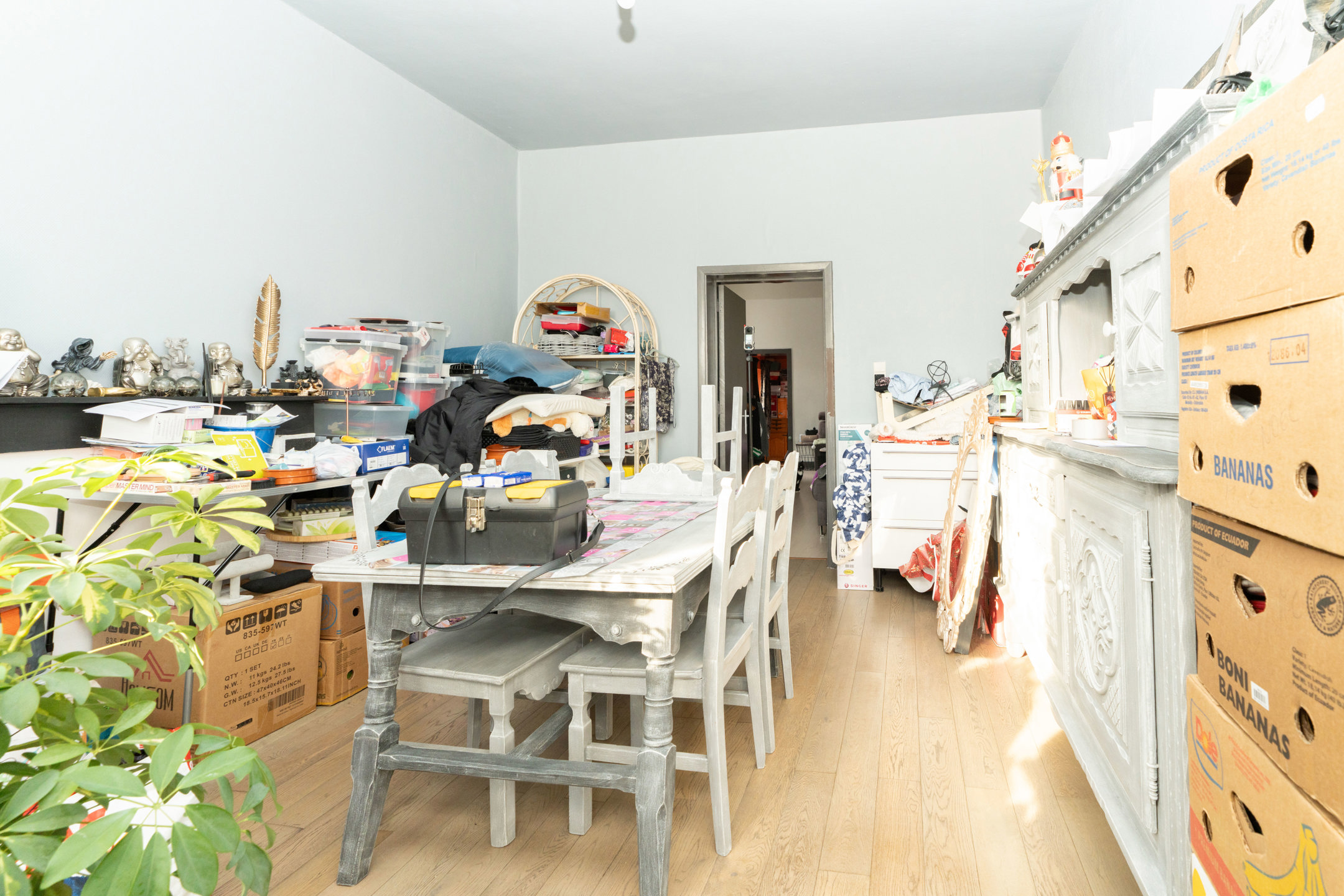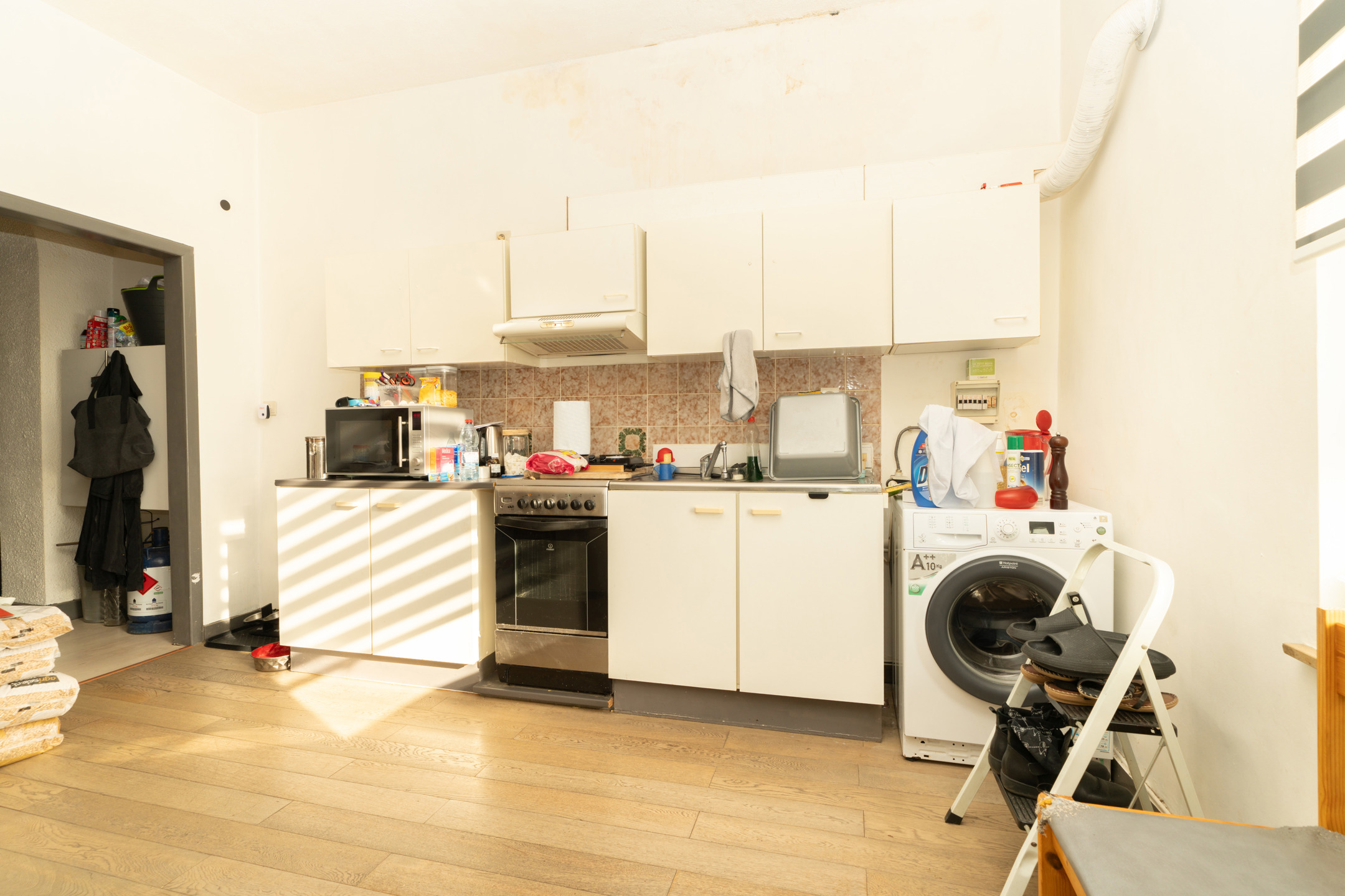 => À l'entresol, un appartement de ± 75 m², composé d’un hall d’entrée, d’une salle de douche avec WC, d’une chambre, et d’un séjour avec cuisine ouverte.