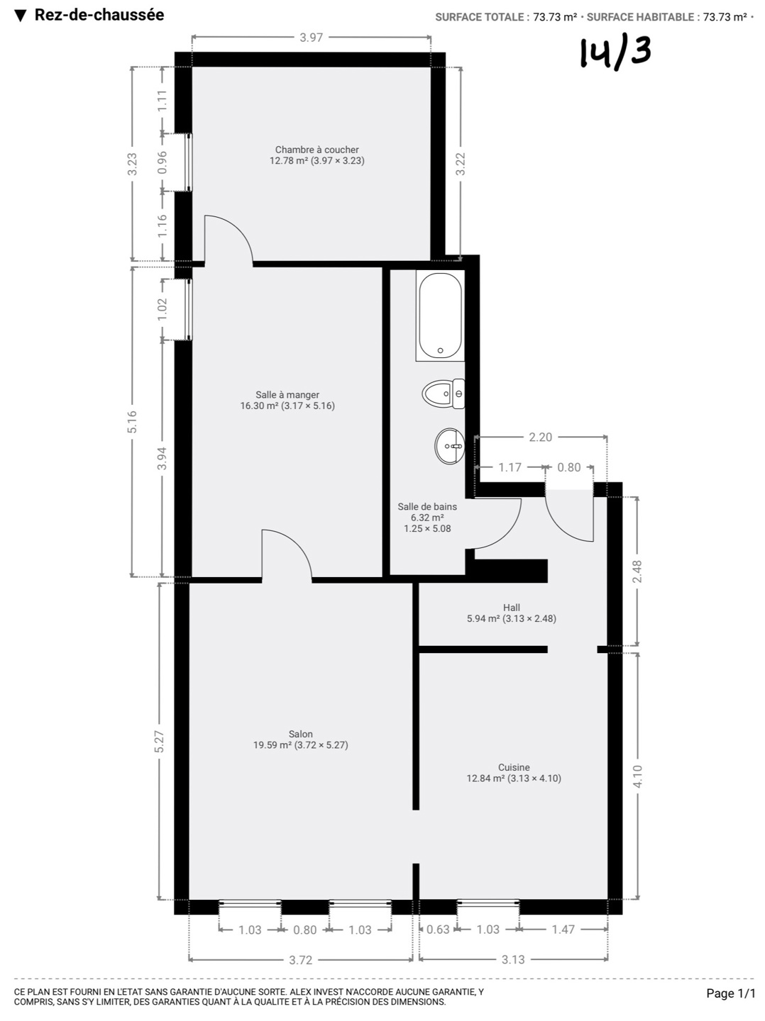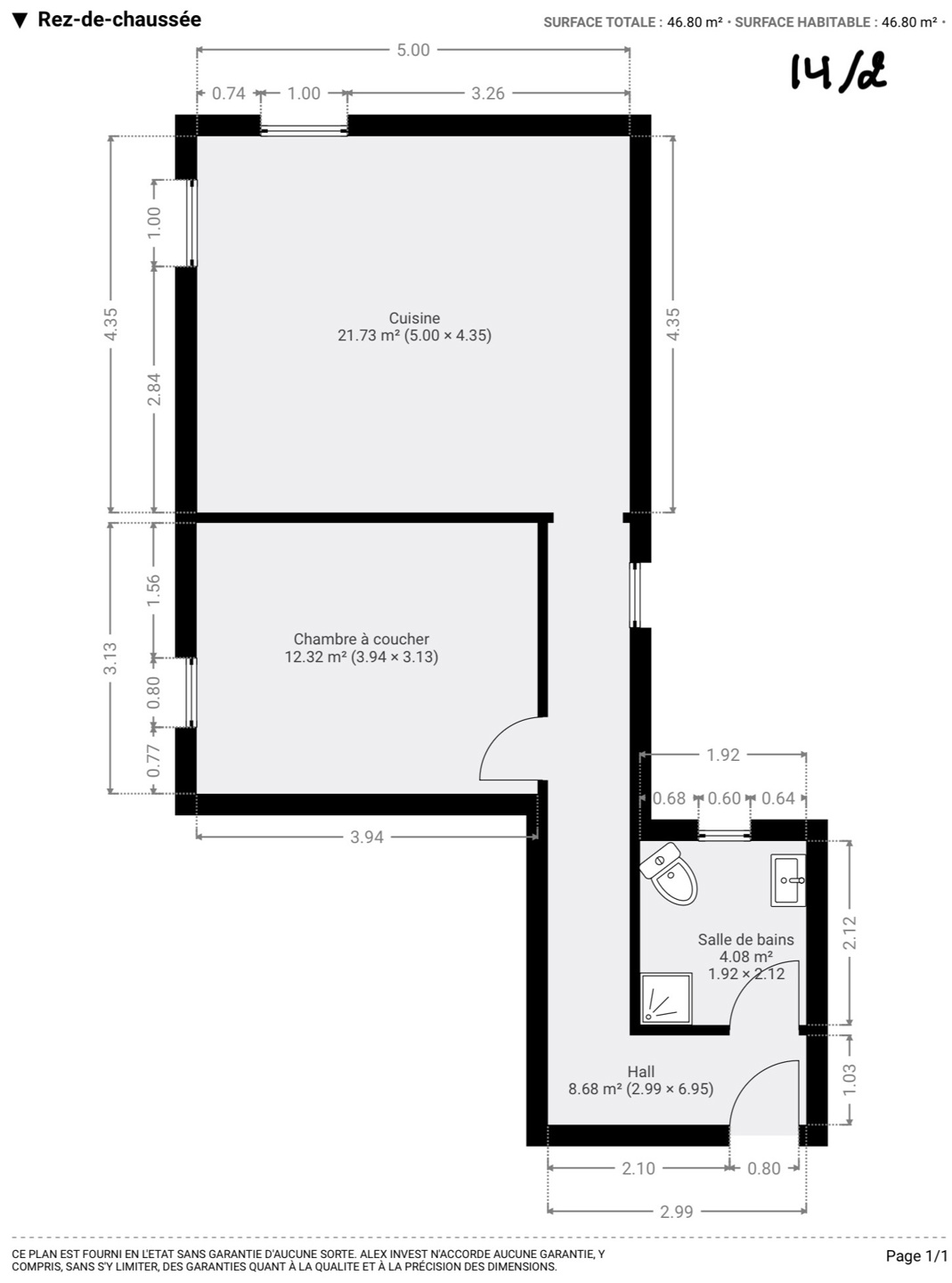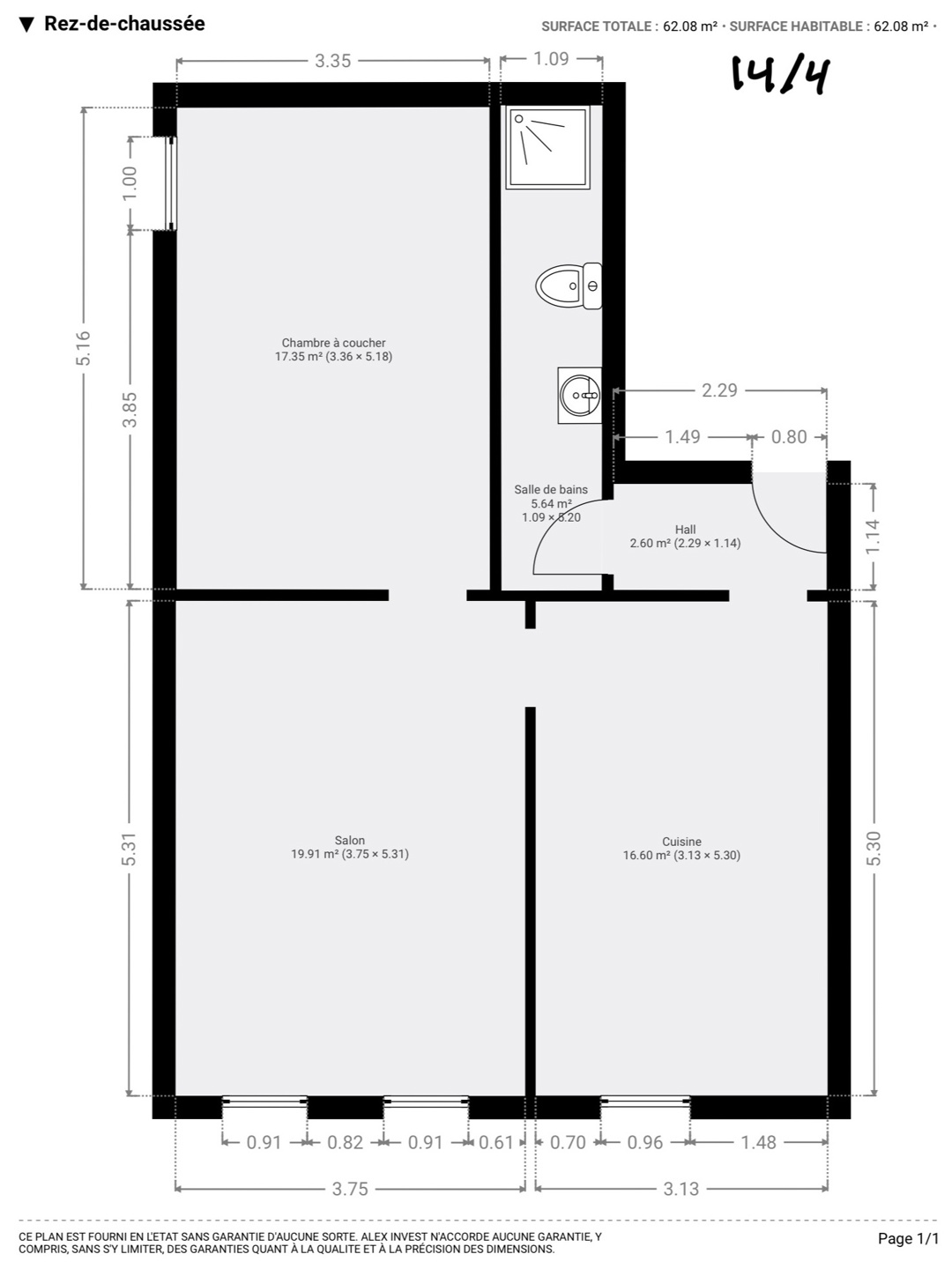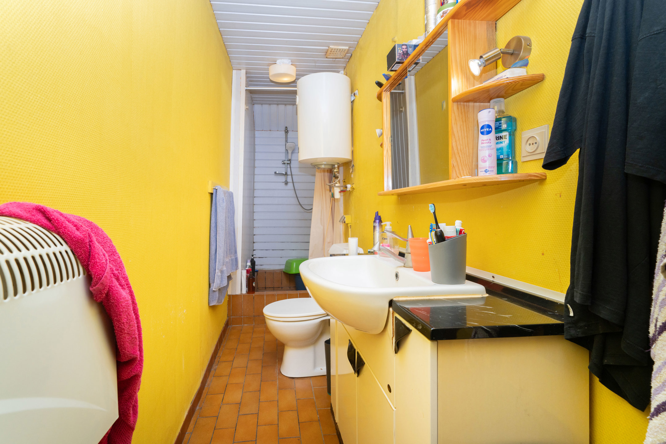 => À l'entresol, un appartement de ± 75 m², composé d’un hall d’entrée, d’une salle de douche avec WC, d’une chambre, et d’un séjour avec cuisine ouverte.