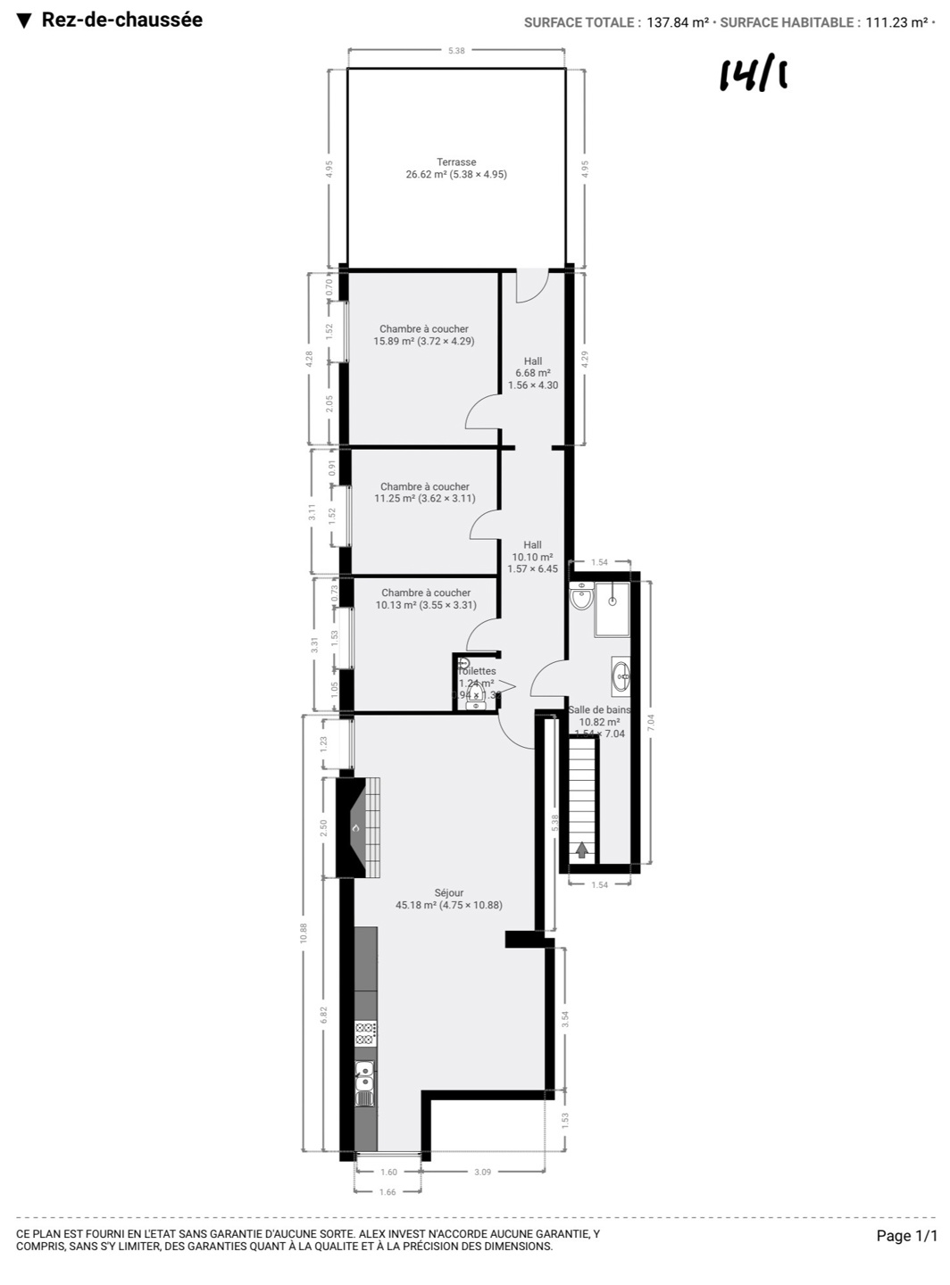 => Le rez-de-chaussée se compose d’un hall d’entrée commun desservant un appartement d’environ 142 m² : spacieux séjour avec cuisine ouverte et cheminée au bois, WC séparé, salle de douche avec espace buanderie et WC, trois chambres, une terrasse et un jardin privatif.