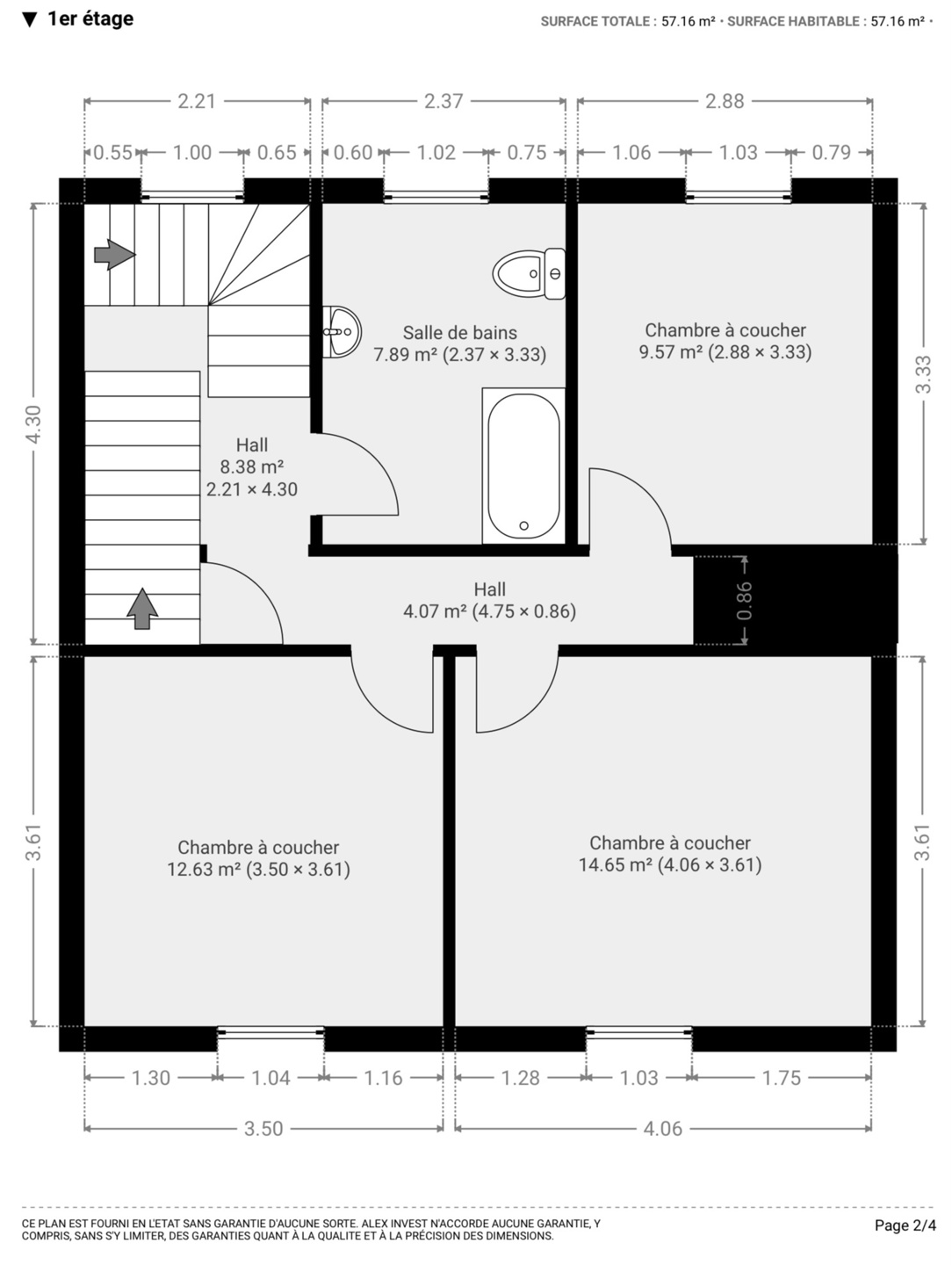 => À l’étage, le hall de nuit dessert trois chambres de +/- 10, 13 et 15 m² ainsi qu’une salle de bain avec WC.